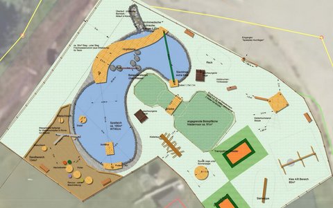 Herzstück ist ein Spielteich mit Spielfloß und angrenzendem Niedermoor-Biotop, der zum Entdecken und Spielen einlädt. Ergänzt wird die Anlage durch naturnahe Bewegungselemente wie Kletterbereiche, Bodentrampoline, Slackline und Matschtisch. Eine Kletter- und Boulderwand sowie die Sommer-Tubing-Bahn bieten zusätzliche Möglichkeiten für aktive Bewegung. (Foto folgt)